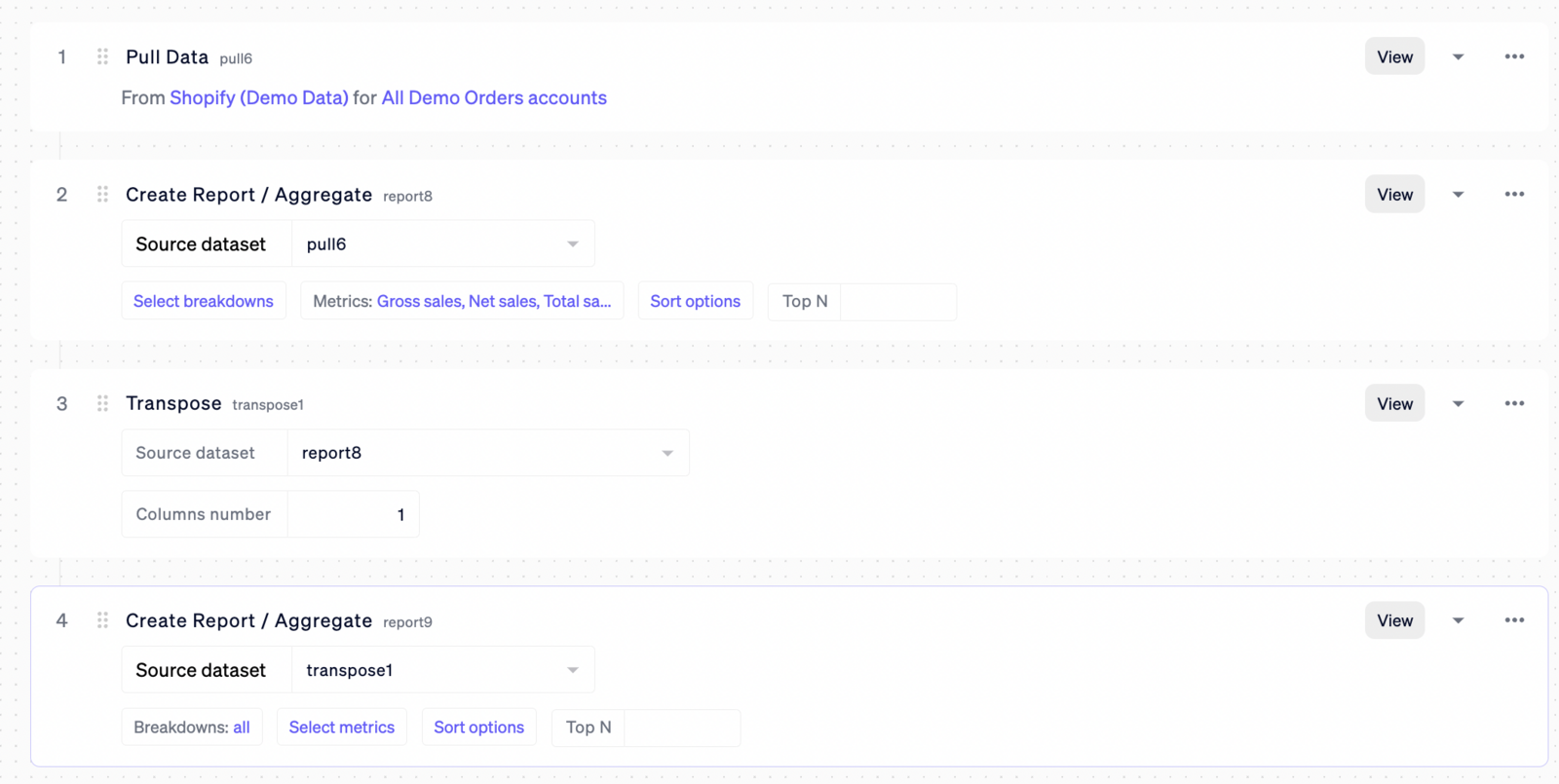 To achieve this, we can use the Transpose block, which switches columns to rows and vice versa. Here is how our Workflow layout setup would look like&#x20;